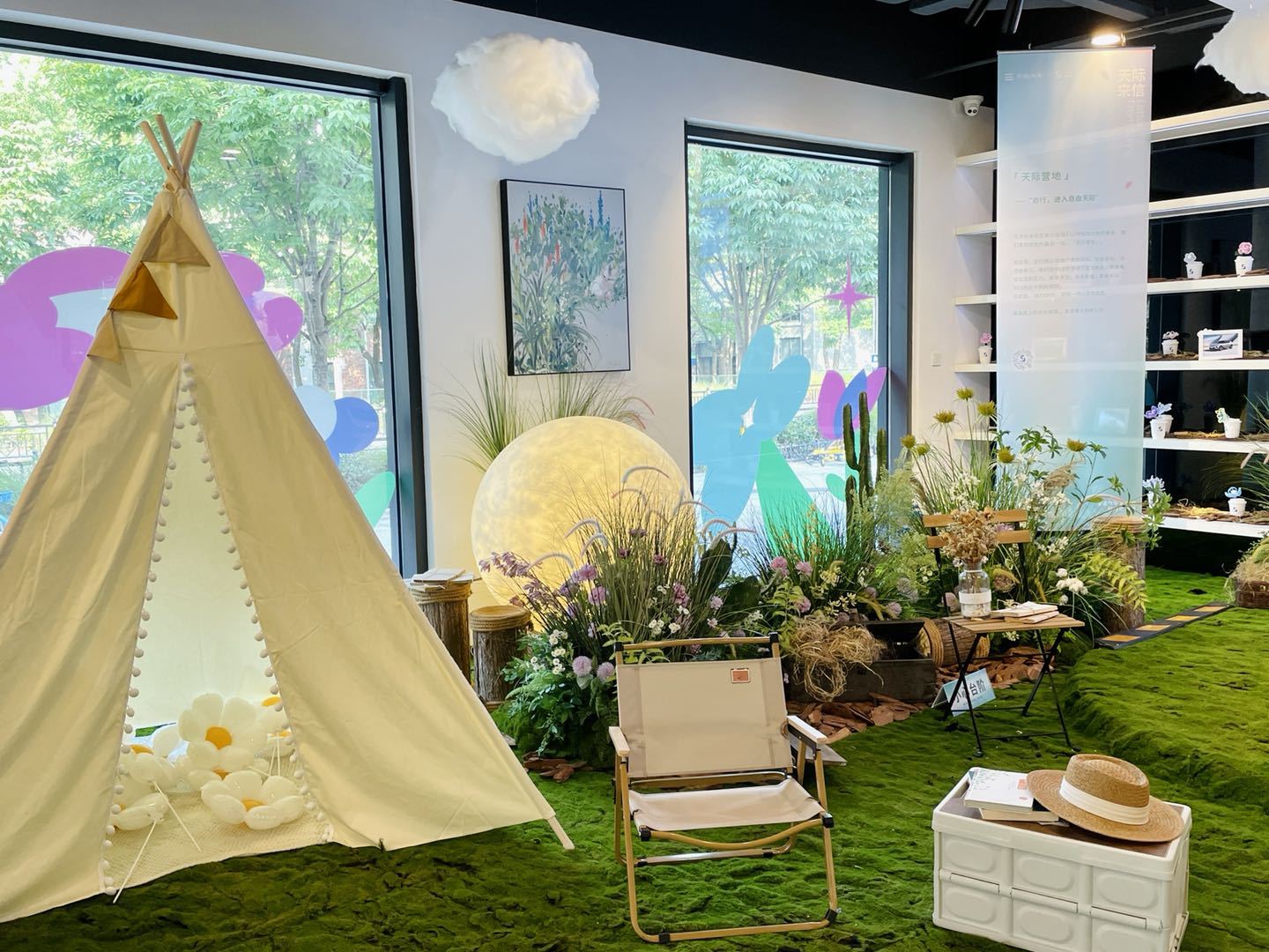 当下,露营逐渐成为受都市人喜爱的一种新生活方式。展览中,天际营地空间就搭建了一处仿真营地,坐在仿真草坪上围坐一圈,可拍摄出犹如真实户外露营的照片,成为展览中颇受好评的一部分。