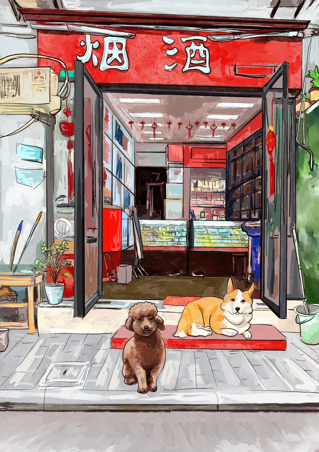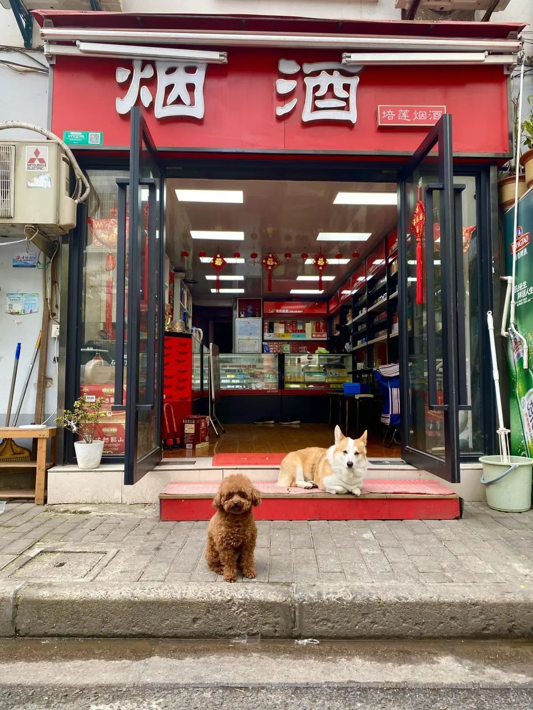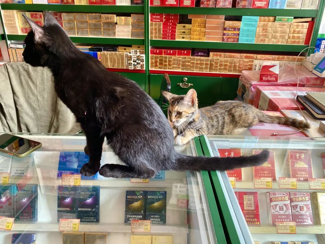 难得出来趴一会的两只狗狗,主人不在店里就由它们临时守铺子。懒洋洋的身姿和惺忪的眼神仿佛在告诉我们,它们有些年纪了,已经步入了闲散的“退休”生活,今天只是偶尔来帮忙。