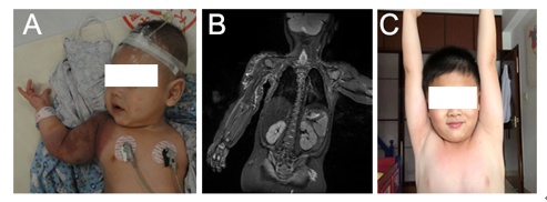 病例1:右肩部、上肢卡泼西样血管内皮瘤伴KMP,经过治疗后6年随访。