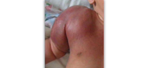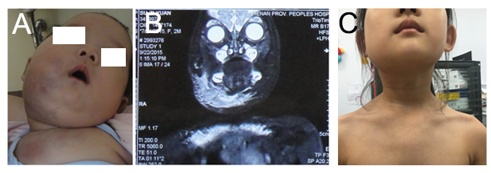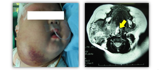 图:下颌、颈部巨大卡泼西样血管内皮瘤伴卡梅现象,患儿伴有明显的气道压迫症状。