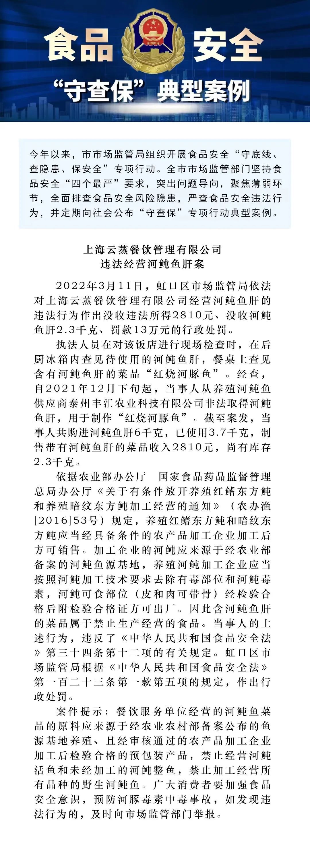 违法经营河鲀鱼肝!上海云蒸餐饮管理有限公司被罚13万