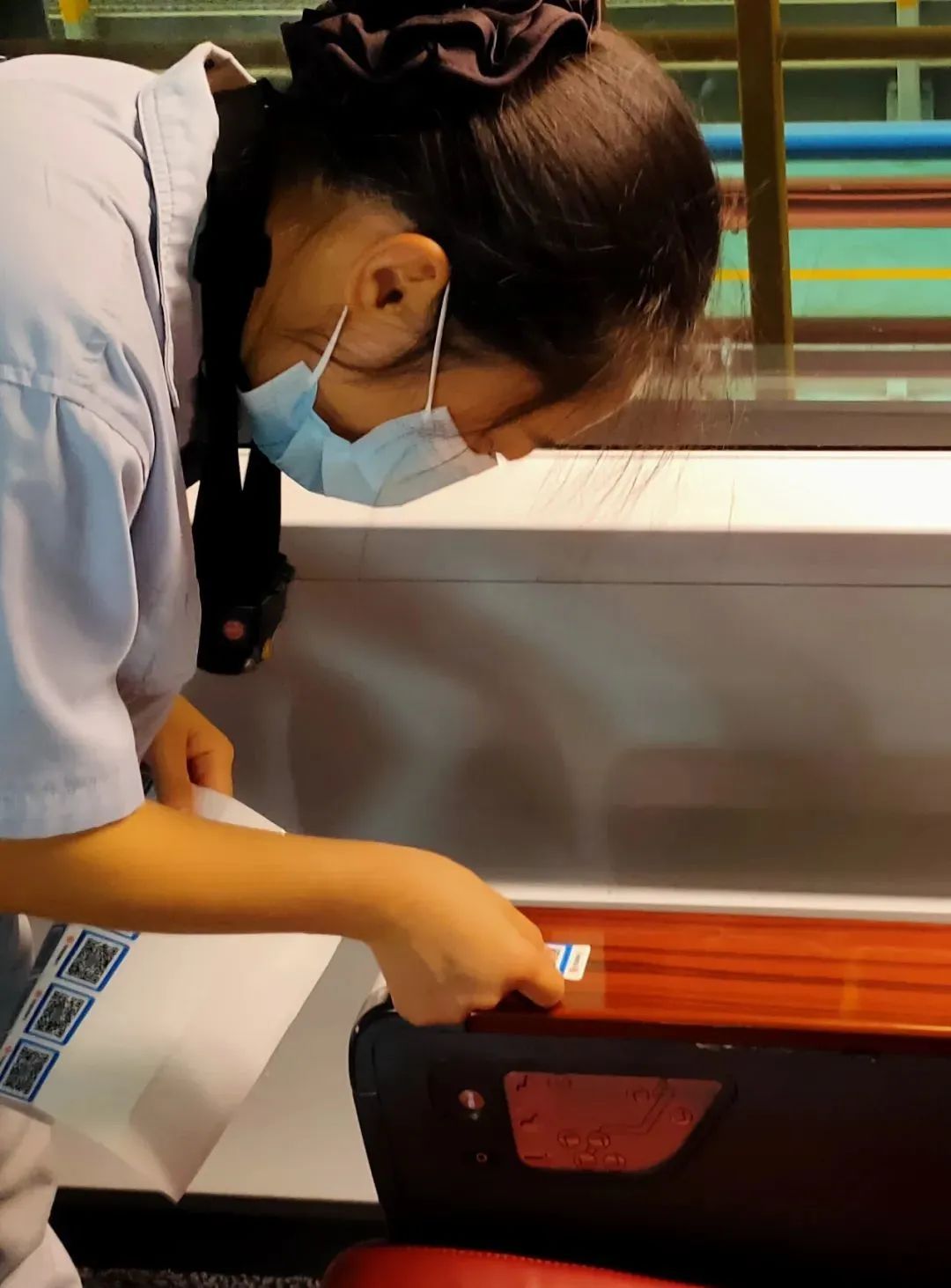 铁路工作人员正在粘贴铁路畅行码↑