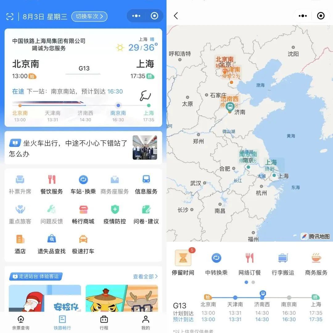 铁路畅行码同时集成12306APP中最常用的补票升席、餐饮服务、遗失品查找、商务座服务、重点旅客、疫情防控、问题反馈、问卷·建议、信息服务、畅行商城等服务功能,旅客打开12306小程序,点击下方“铁路畅行”也可直达该页面。
