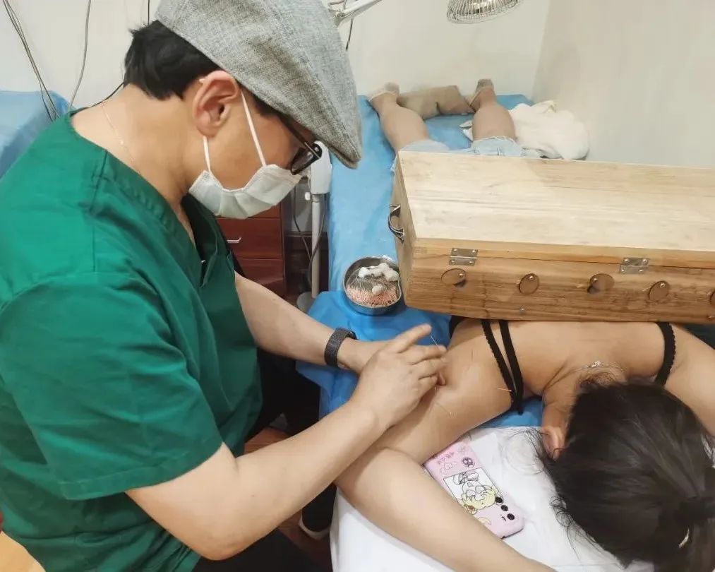 将灸箱放在患者的后背上,接着吴耀持又为患者进行了杵针治疗。