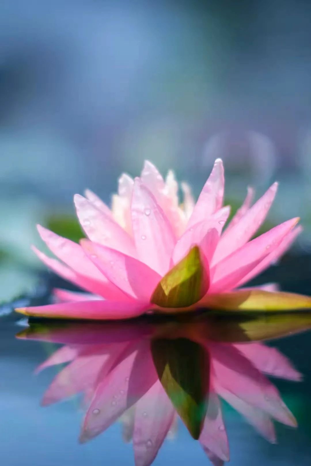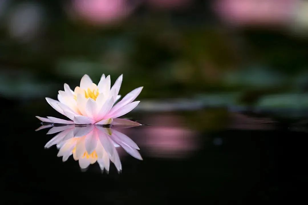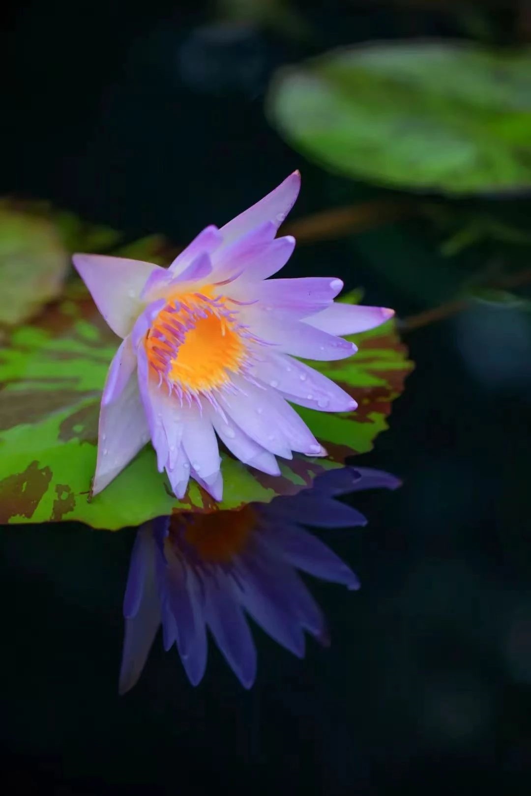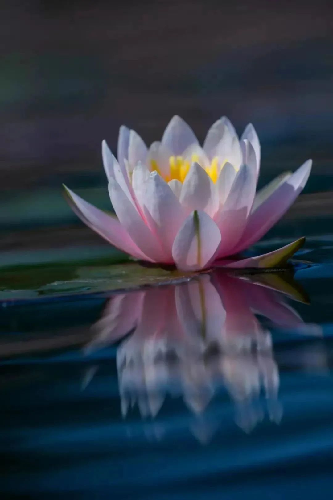 拍摄睡莲时,可以利用水面的倒影,形成巧妙的构图,增强照片的立体感。