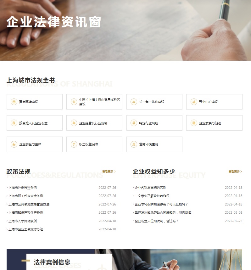 “企业法律资讯窗”整合上海城市法规全书、政策法规、企业权益法律分析文章、企业合规实务操作手册以及经营风险数据报告,帮助企业积累法律合规相关知识,引导企业合法合规经营,提前预防和控制内外部风险。