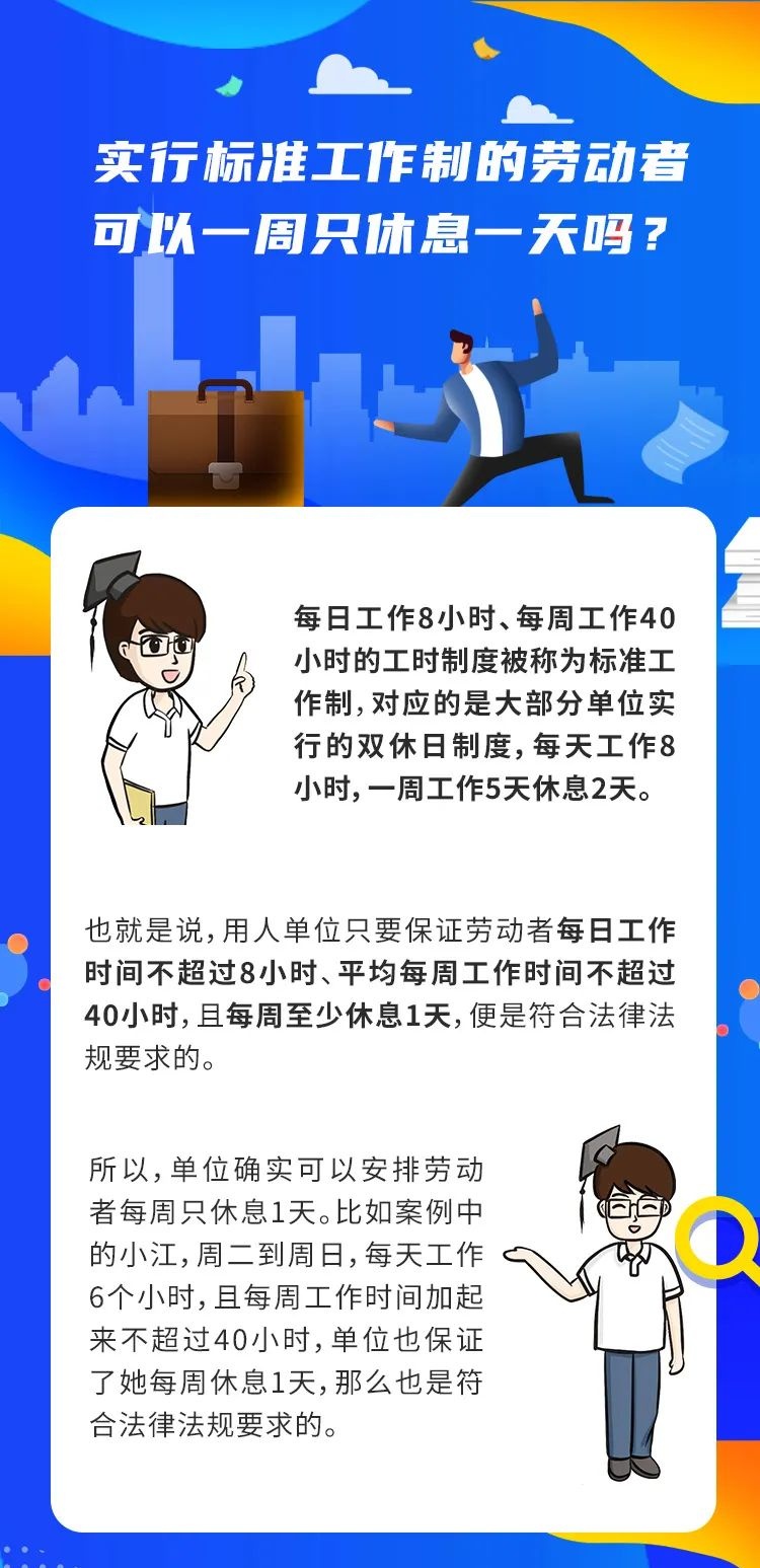 小江最近应聘到一家美术馆工作,担任讲解员。双方合同约定,小江的岗位实行标准工作制,每周一休息,每天工作6个小时。小江疑惑,她的双休日怎么不见了呢?公司这样约定没问题吗?来看解读↓