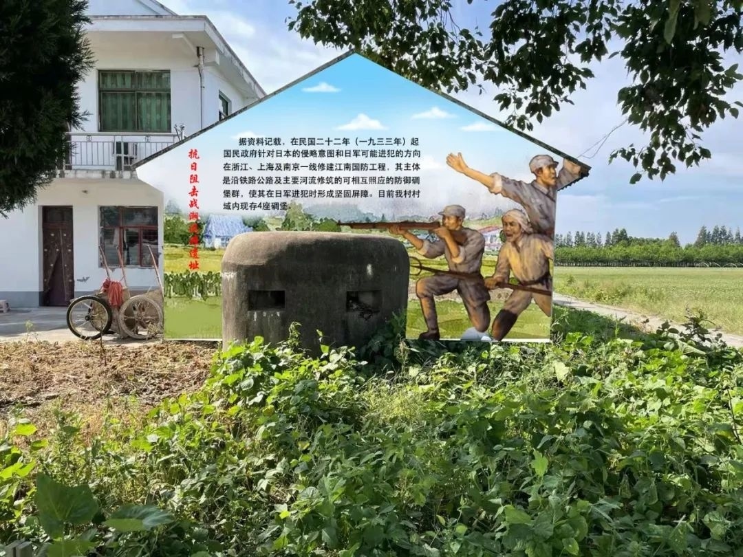 在这次人居环境提升行动中,团新村选择了位于村子中段7组附近的一座碉堡,为它拂去尘埃、建立文化背景墙,将这一段历史渊源以图文并茂的形式陈列其上,把团新的故事重新讲述。在碉堡旁边,村“两委”还租下了村民的闲置房屋,将其改造成多功能活动室,建立了党群服务点。从此,村里的孩子每次经过碉堡都会把先辈们英勇抵御日寇侵略的故事温习一遍,而见证了历史的碉堡也继续默默守护着村民们的安居乐业。