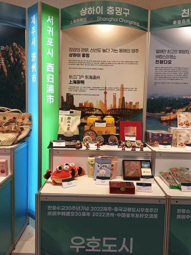 2022年是中韩建交30周年,也是崇明与西归浦市签订友好交流关系城市的第五年。2022年8月5日,由济州特别自治道厅和中国驻济州总领事馆共同主办的主题为“携手同心、共创未来”的庆祝中韩建交30周年“济州-中国省市友好交流周”开幕,崇明文旅商品精彩亮相韩国,展示了崇明文化特色,体现了两地友好。