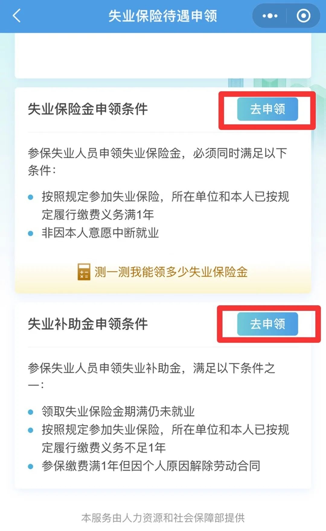 2.点击失业保险金或失业补助金【去申领】。