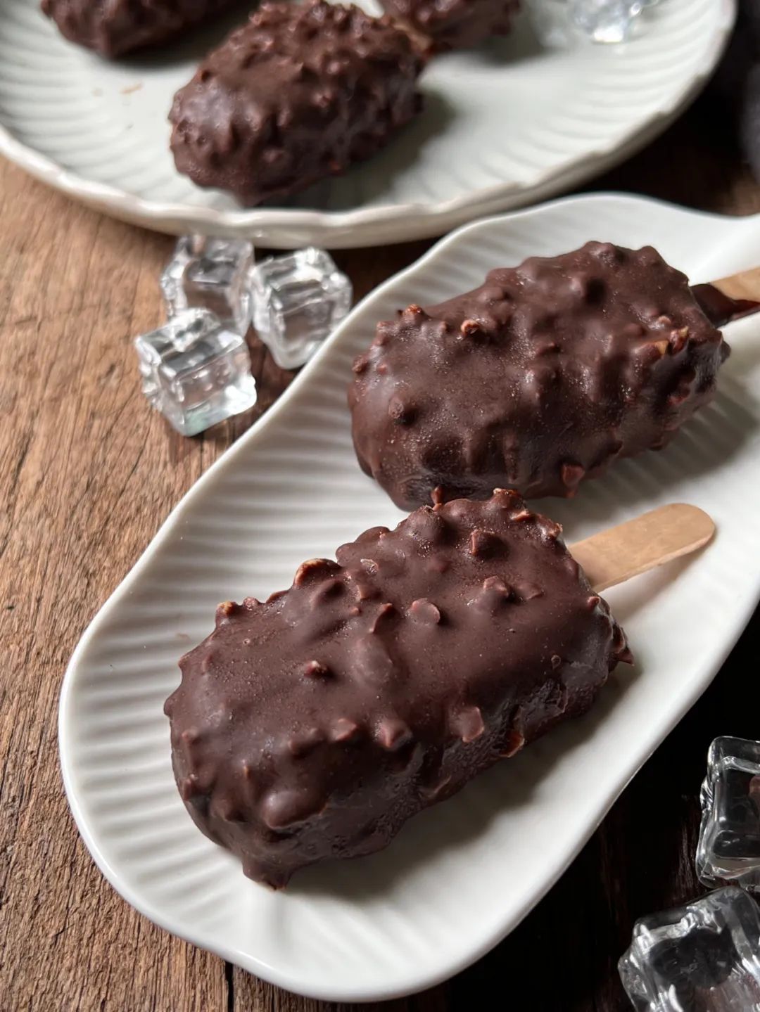 5. 取出冷冻硬的雪糕放入杯中均匀沾巧克力榛子脆皮,凝固后即可食用。