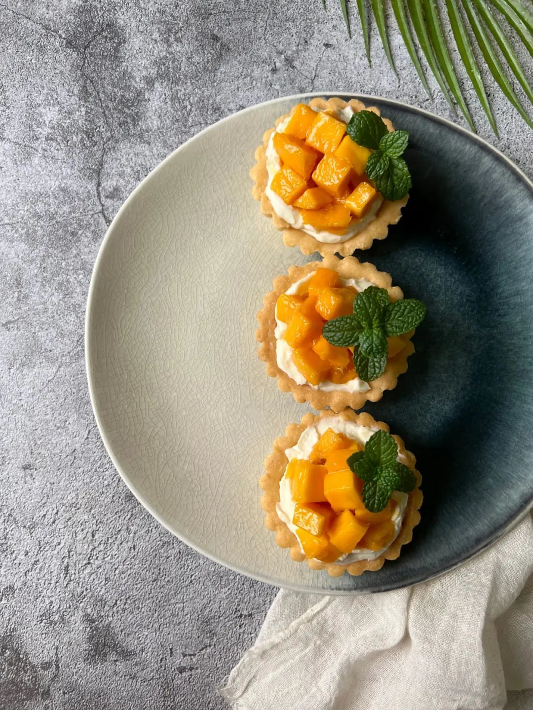 5. 芒果去皮切块,奶油奶酪室温软化,加柠檬汁糖粉用电动打蛋器打顺滑,舀入挞皮里面,摆芒果食用。