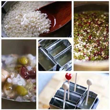 1. 糯米泡清水2小时后沥干备用,赤小豆加炒熟薏米、绿豆后,放入冷水锅煮开,大滚3分钟后沥干备用。