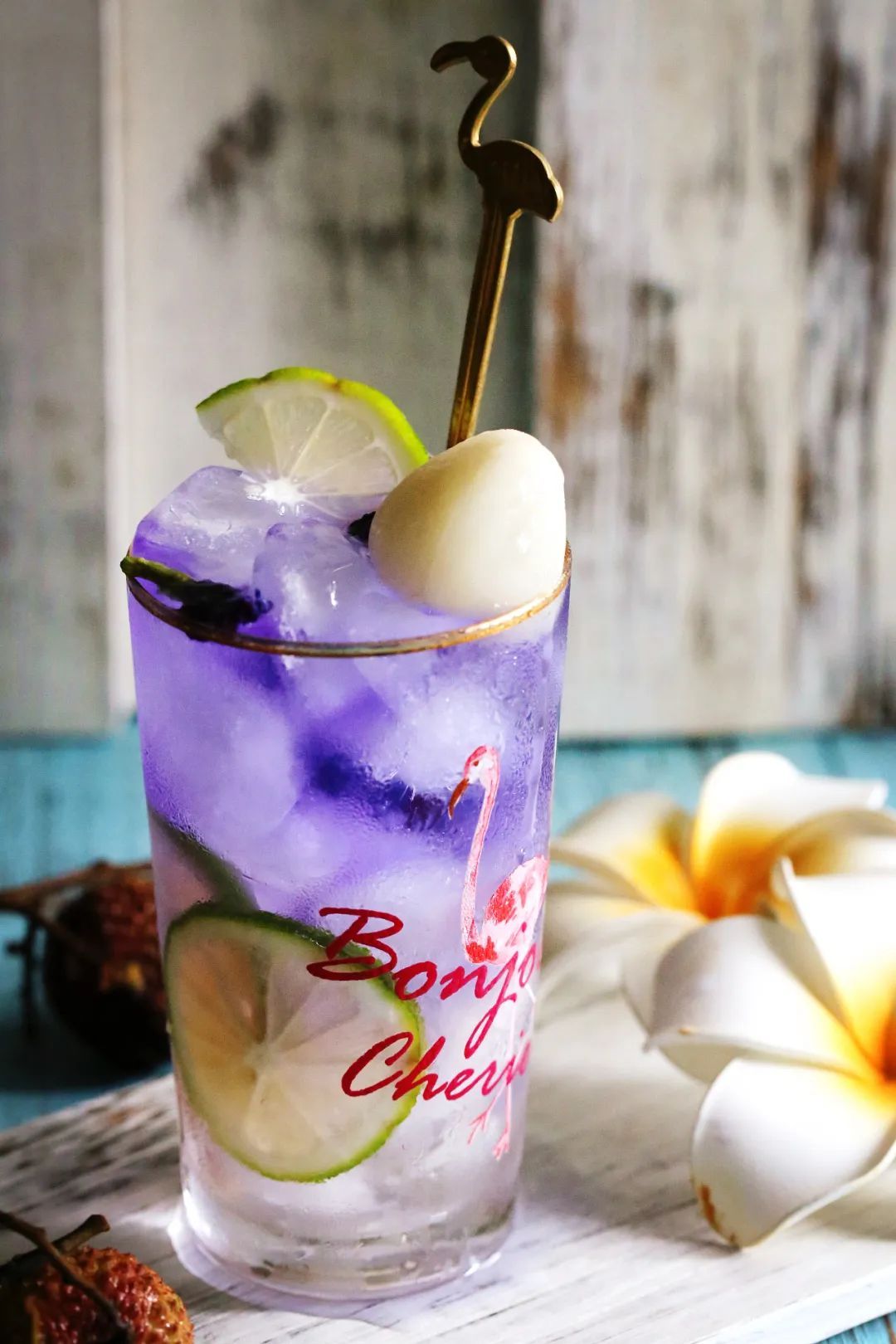 5.蝶豆花茶从杯口边缘,以非常缓慢的速度加入杯中,杯中饮品会有明显的分层,最后加入装饰荔枝,并放上剩下的青柠檬片点缀。
