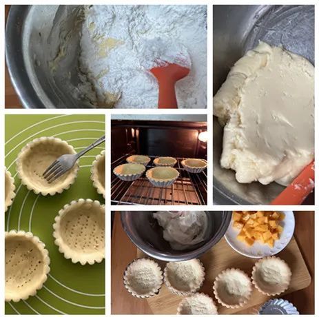 挞皮材料:低筋面粉80克,黄油55克,杏仁粉20克,糖粉25克, 蛋黄半个