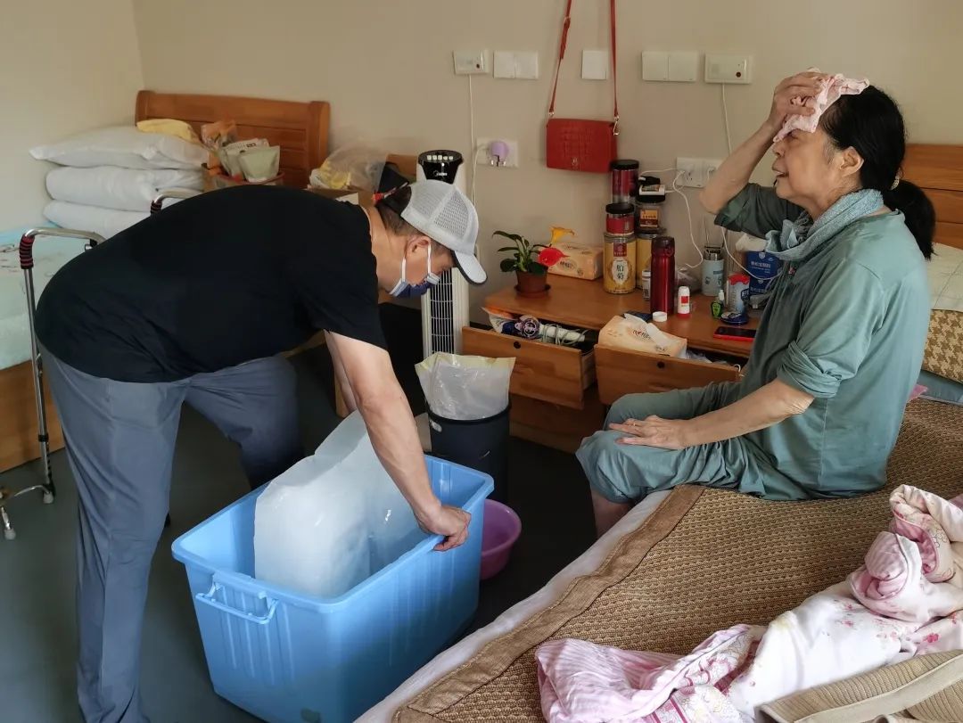 当老人们享受到冰块带来的阵阵凉意,看到院长和员工们个个累得汗流浃背,老人们的内心又一次被感动了。原本担心老人能否经受住这数小时桑拿煎熬的家人们,听到院方付出这么大的努力,都纷纷通过徽信群向院方表达了感谢和赞美。