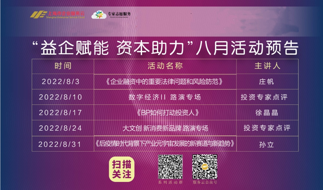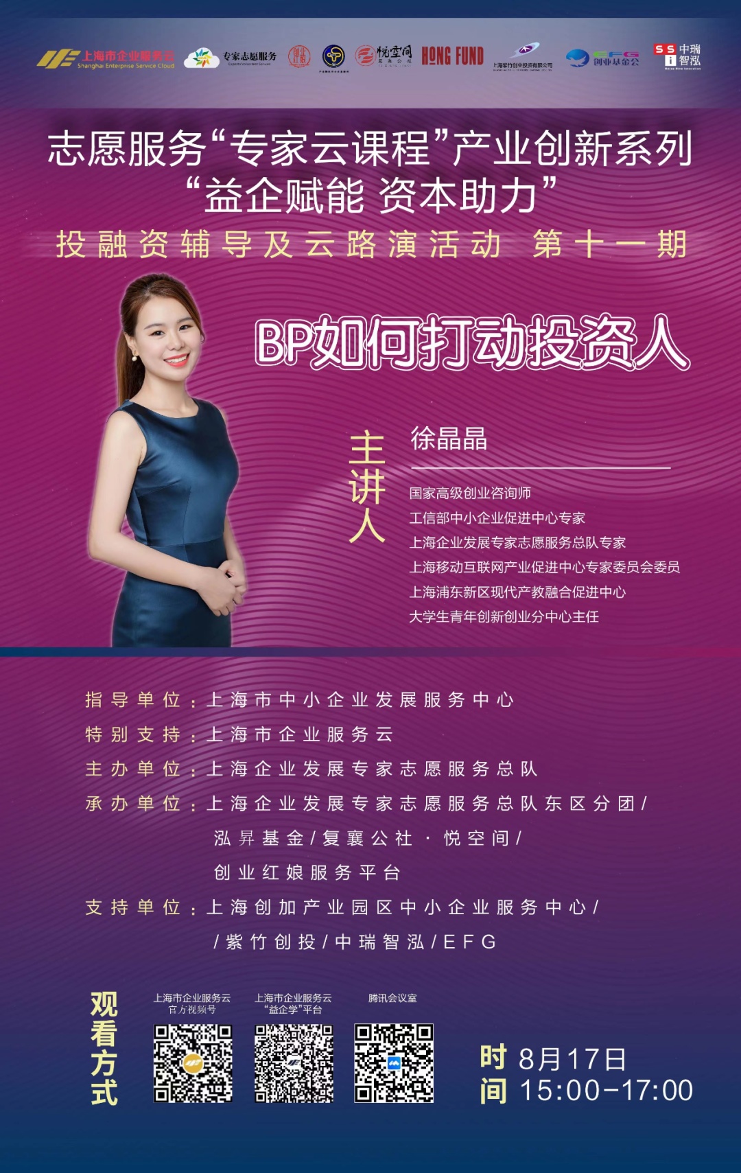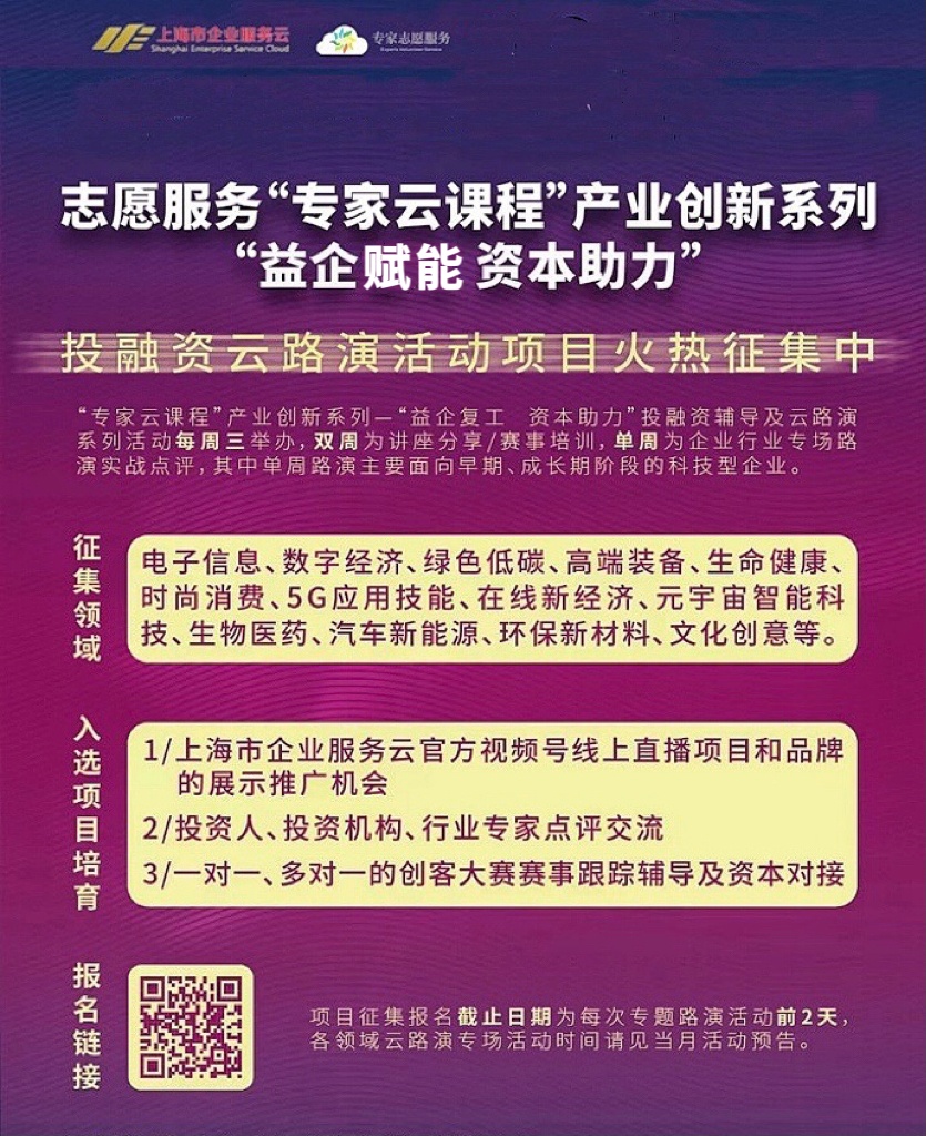 2022创客中国上海市中小企业创新创业大赛已经启动,为了助力企业在赛事和融资中提升竞争力,在上海市中小企业发展服务中心的指导下,依托上海市企业服务云平台,上海企业发展专家志愿服务总队联合泓昇基金、复襄公社·悦空间、创业红娘服务平台等共同助企纾困,搭建投融资加速平台,举办志愿服务“专家云课程”产业创新系列—“益企赋能 资本助力”投融资辅导及云路演活动,自6月8日起每周三下午15:00,“讲座分享+行业专场路演”单双周交替上线。