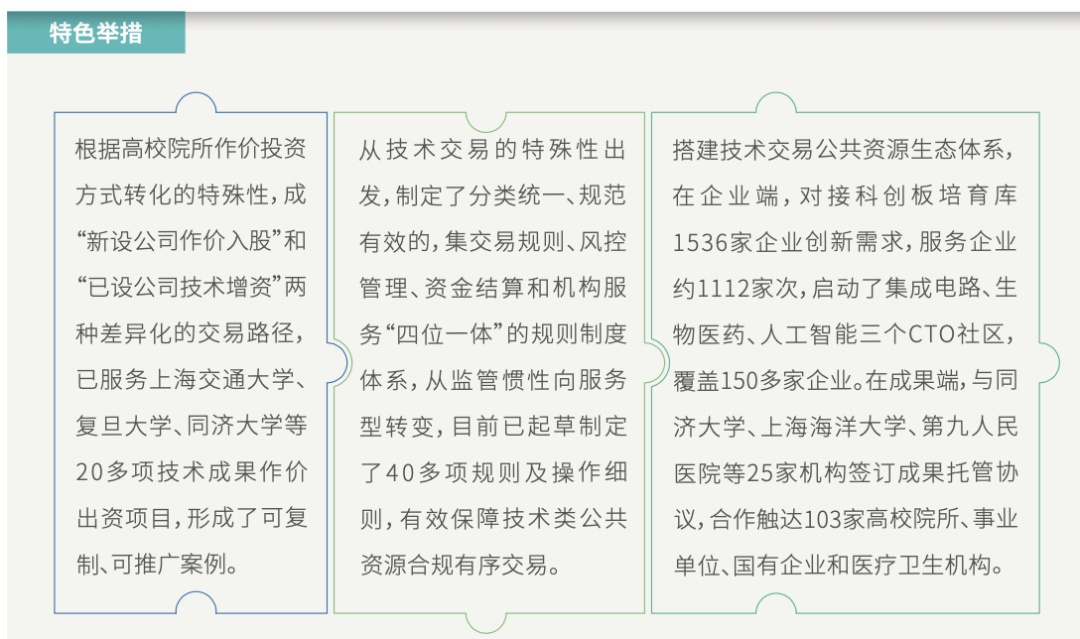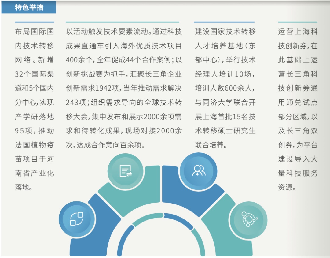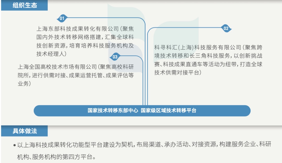 上海紧跟中央部署,深化体制机制改革,进一步激发高校院所成果转化活力;支持企业开放式创新,加快建立需求导向的成果转化服务体系;着力完善技术要素市场,强化技术要素市场化配置,促进技术、人才、资本等要素融合发展。