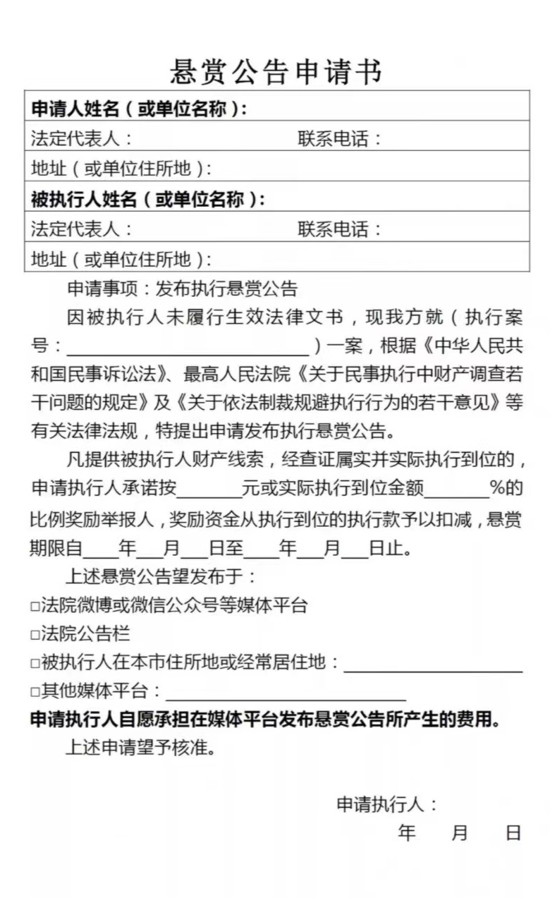2.发布。悬赏公告应当在全国法院执行悬赏公告平台、法院微博或微信等媒体平台发布,也可以在执行法院公告栏或被执行人住所地、经常居住地等处张贴。申请执行人申请在其他媒体平台发布,并自愿承担发布费用的,人民法院应当准许。