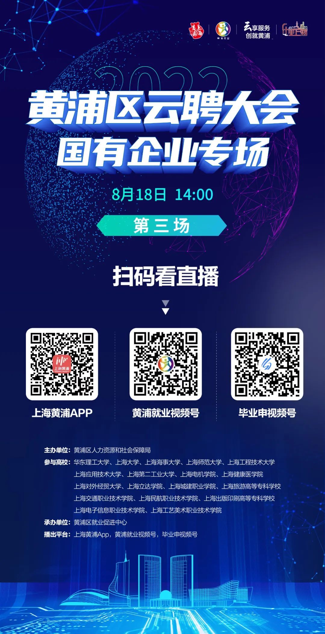 为贯彻落实党中央、国务院稳就业保就业的决策部署,切实满足黄浦区国资国企重点企业的招聘需求,积极做好疫情防控常态化下的高校毕业生就业工作,打响黄浦区“高校毕业生就业创业服务季”工作品牌,黄浦区开展“云享服务 创就黄浦”云聘大会系列活动。8月18日(周四)14:00,推出第三场国有企业专场直播带岗活动!