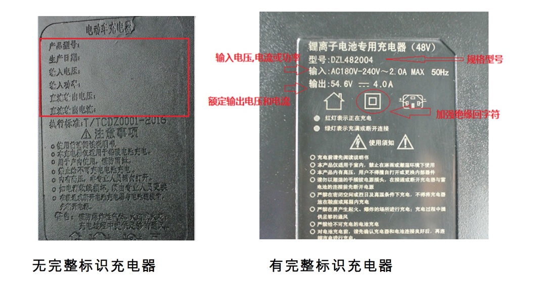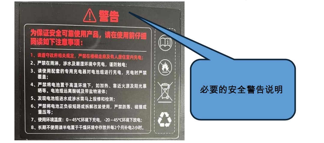 4.必要的中文安全警告说明(例如电动自行车蓄电池外包装或说明书应有“小心轻放”“避免潮湿环境”等警示用语;电动自行车充电器警告标识或说明书应至少包含“禁止给不可充电的电池充电”“充电过程应提供足够的通风”等类似内容)