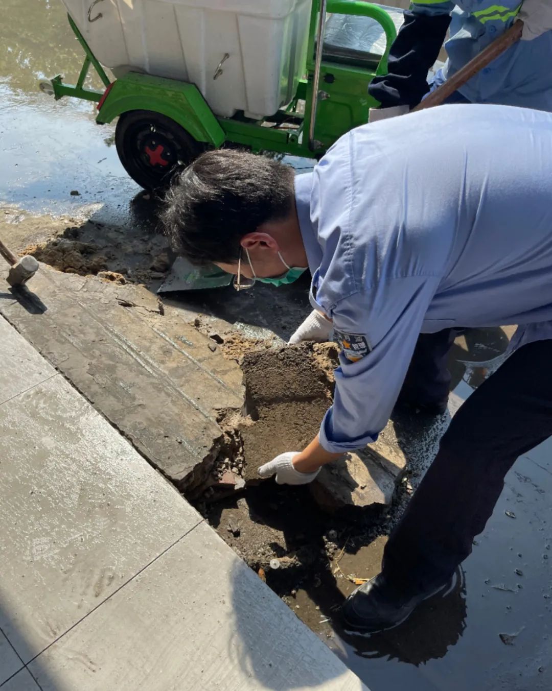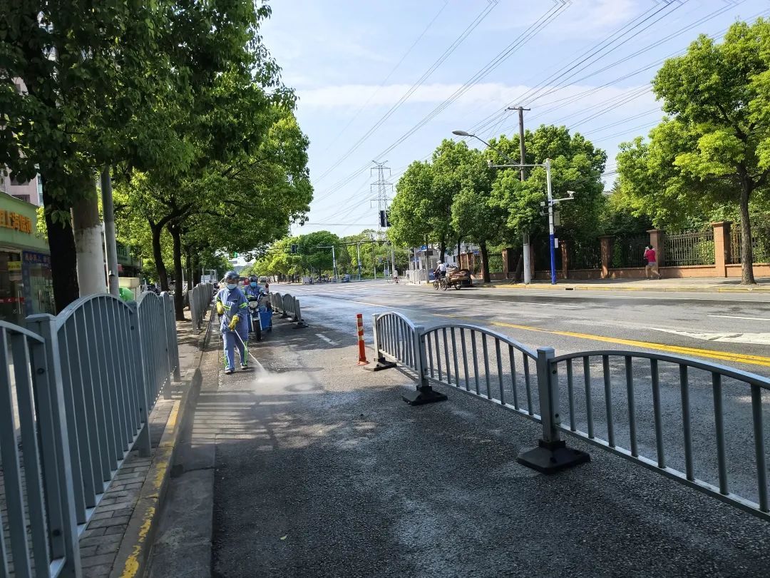 记者在主活动地点顾村镇共富菜市场周边看到,宝山区顾村镇城管执法人员、市容管理第三方队伍、区绿化市容局宝谊公司、菜场管理人员以及沿线单位工作人员各司其职,他们有的清理绿化带、暴露垃圾,有的进行道路保洁和冲洗,还有的对公共区域的垃圾筒进行清理、消毒,通过环境卫生的大清理、大扫除、大整治,使环境不论从平面到地面到空间,都能保持基本的整洁。同时,相关工作人员还对沿街商户上门进行市容环境、疫情防控宣传,引导他们提高防疫意识和责任意识,营造良好的防疫氛围。