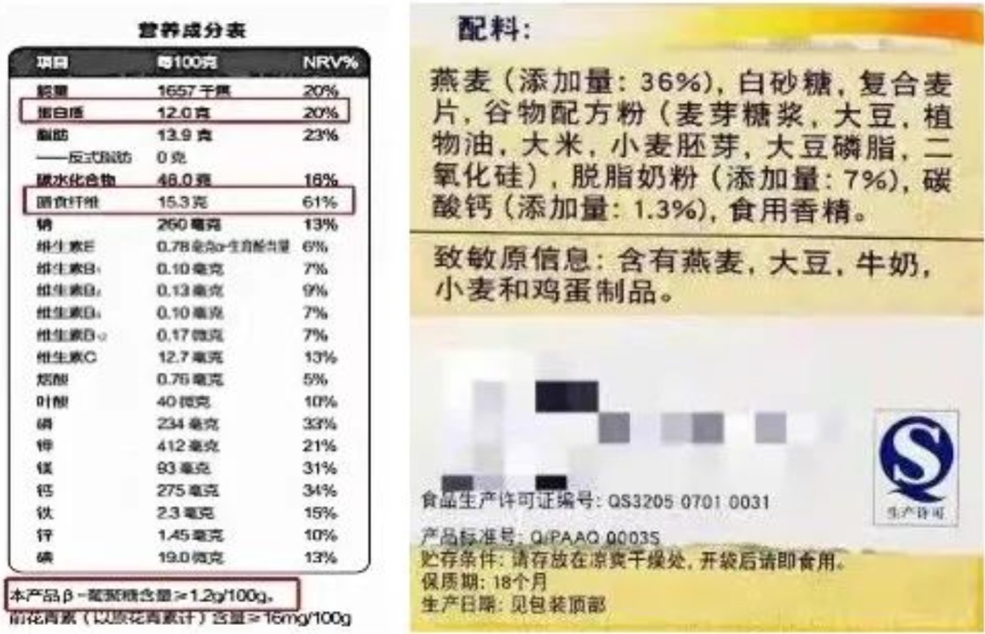 左图燕麦的蛋白质含量高,膳食纤维丰富,明确标明β-葡聚糖含量。右图燕麦片含量低,由多种谷物混杂,含有白砂糖。对于血糖高的人来说,购买左图的食品更好 l 瑞金医院