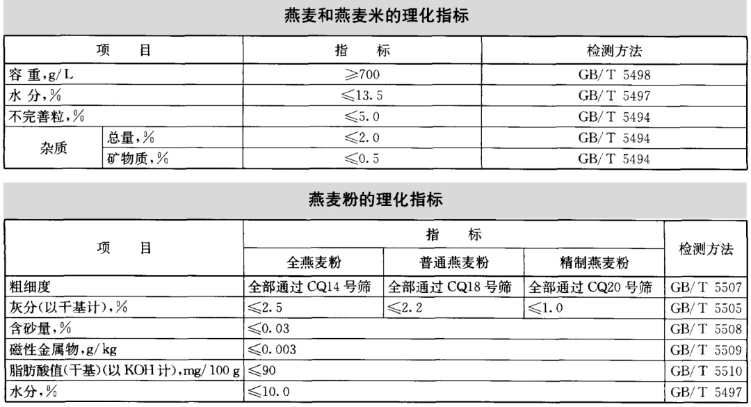 NY/T 892-2014 《绿色食品 燕麦及燕麦粉》中的产品理化指标要求