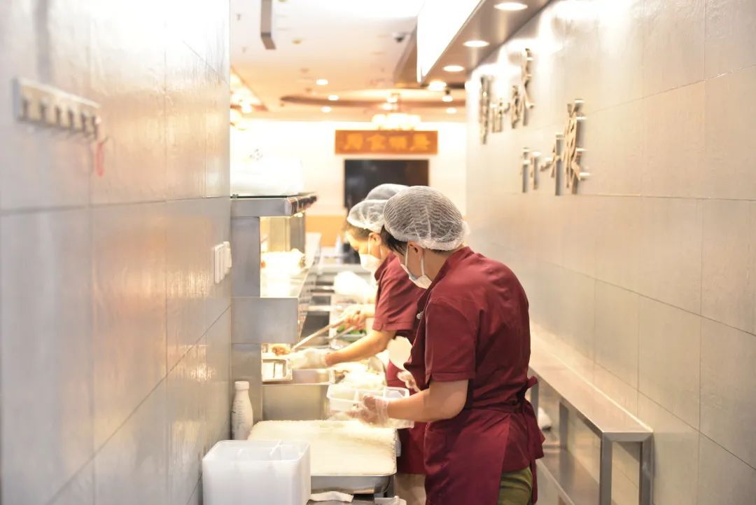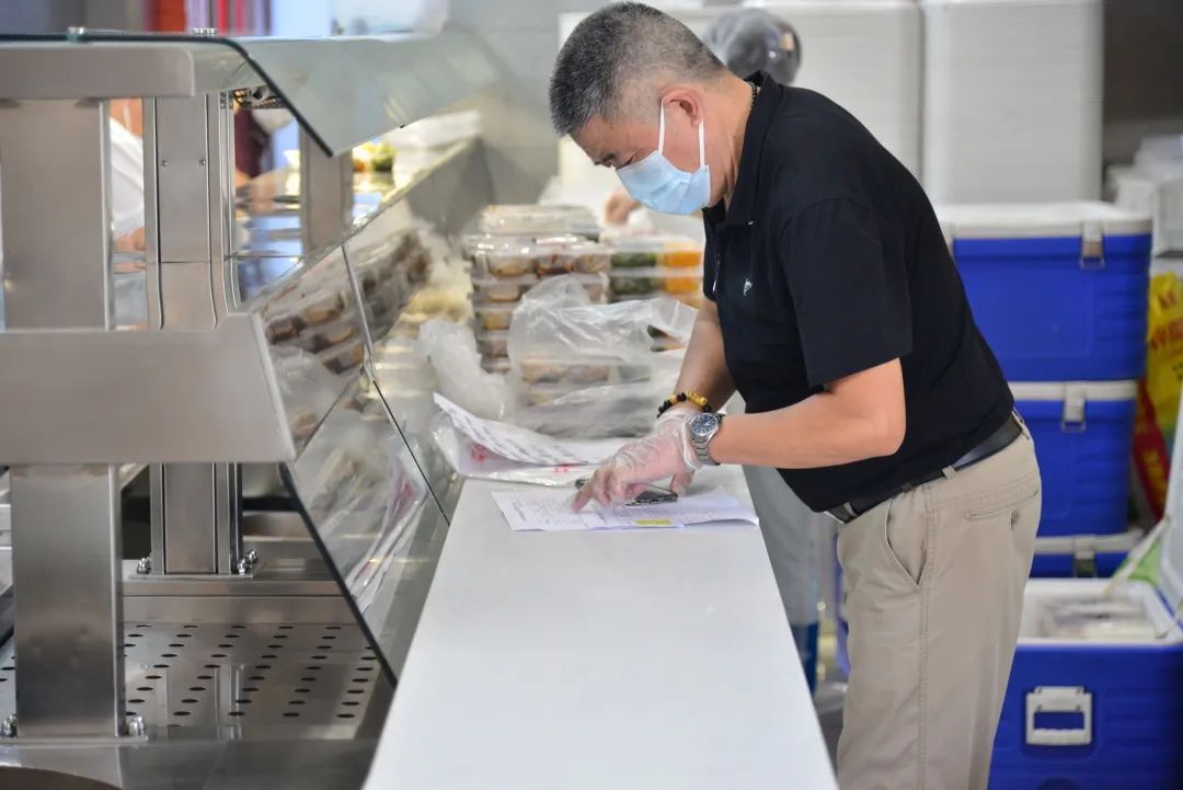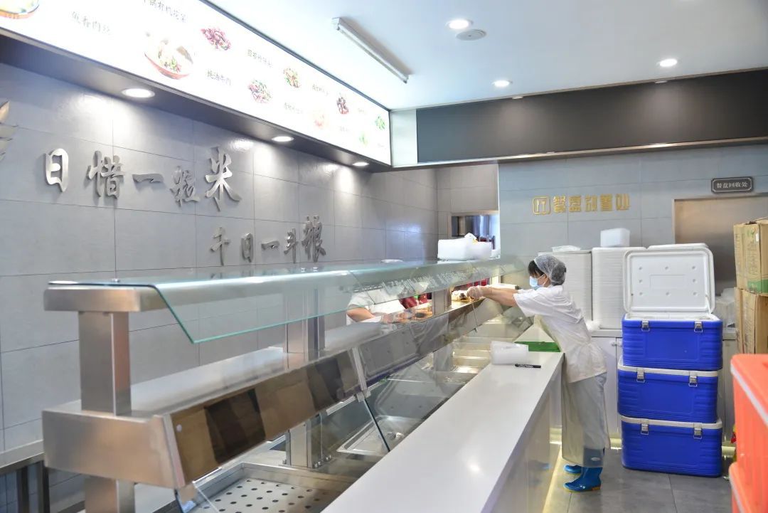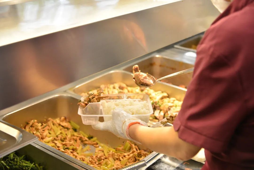 一盘盘热气腾腾的餐食已经在点菜区“就位”,工作人员们互相配合,按照不同的餐标将菜品分类、依次装盒。