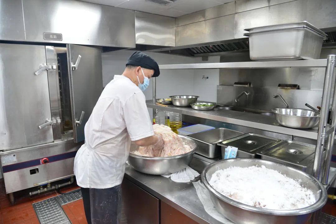 在核对好当天的菜单后,大厨们有序就位,热火朝天地炒起了大锅菜。洗锅、开火、倒油……厨师们手上不停,只为保证能够在八点前做好全部的餐食。随后,葱油鸡、芹菜香干肉丝、土豆烧排骨……一道道菜依次出锅,保证每个星期的菜谱都不重复。