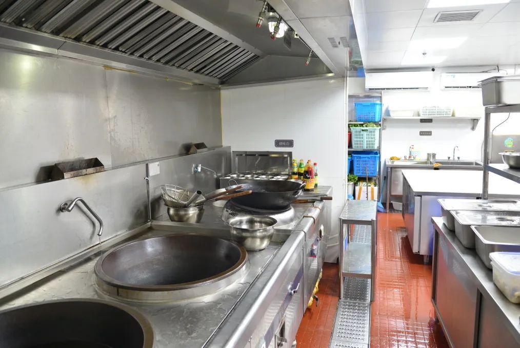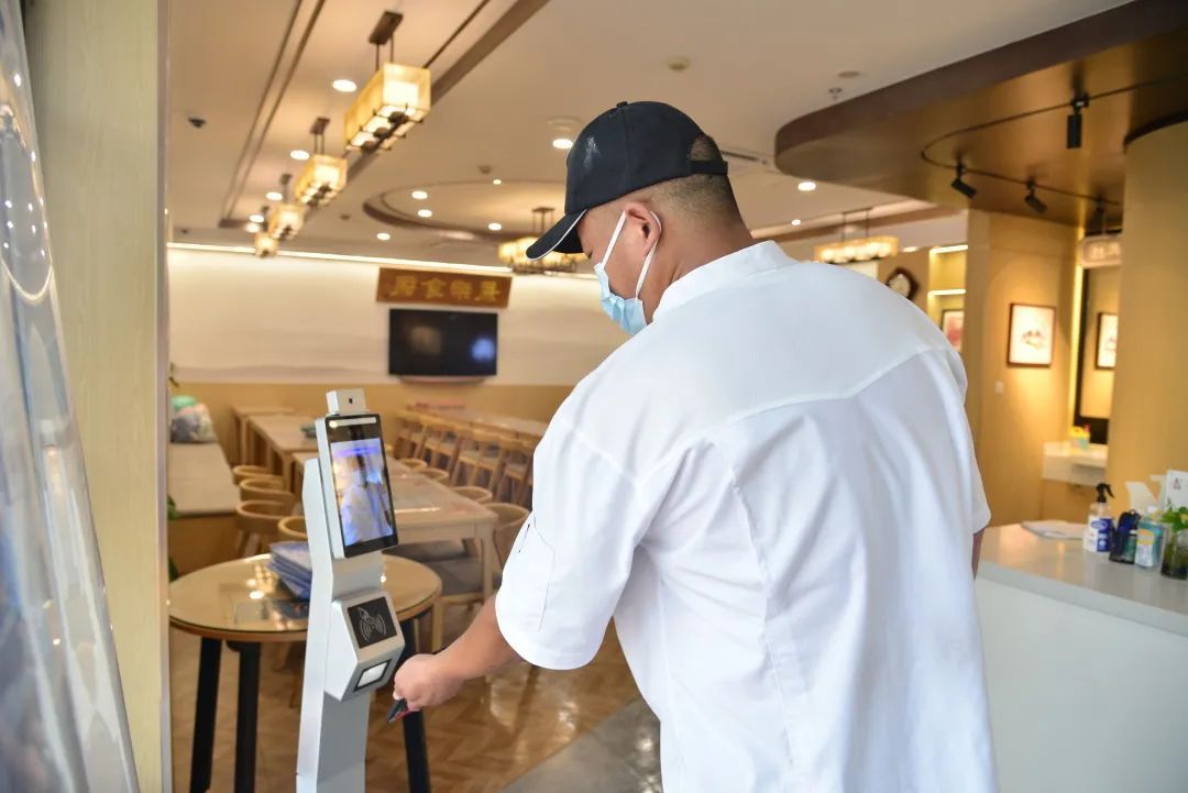 街上空空荡荡,但康乐社区食堂后厨的灯准时亮起。工作人员在门口经由数字哨兵核验后,依次穿戴好手套、帽子等,并有序进入后厨。