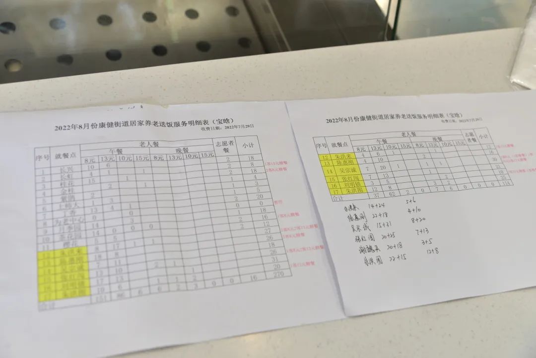 在餐台的另一侧,台面上摆着几张A4纸,上面记录着每个小区不同套餐的需求份数,表格的最后还用红色的字体备注了无糖套餐的份数。“怕看不清楚,我还用黑色的马克笔手抄了一份。”工作人员甄师傅不好意思地笑了笑。“每天早上我就这么一行一行地核对下来,然后把盒饭分批装箱。”