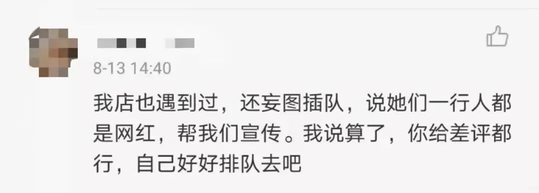 还有网友表示,自己碰到过这样的“网红”,直接要求免单、插队等“福利”,否则就会给差评。
