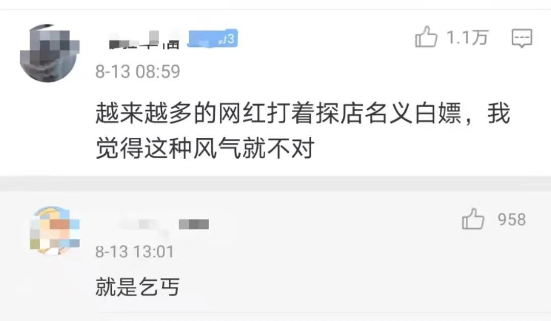 有网友说,现在很多所谓的“网红”打着探店的名义“白嫖”, 这种风气该停了。