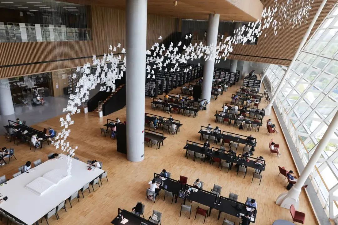 来到三楼阅读广场,从南边庭看出去,有一片树林,读者如同在树冠上眺望。艺术家徐冰的装置“鸟飞了”,从中央方桌的“书本”里“飞”出。816个不同字体的“鸟”字,从印刷体向楷书、隶书、小篆一路演变。最后,远古象形文字的“鸟”,成群飞向窗外的树林。