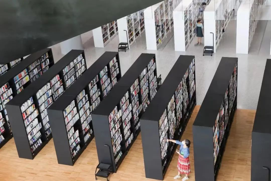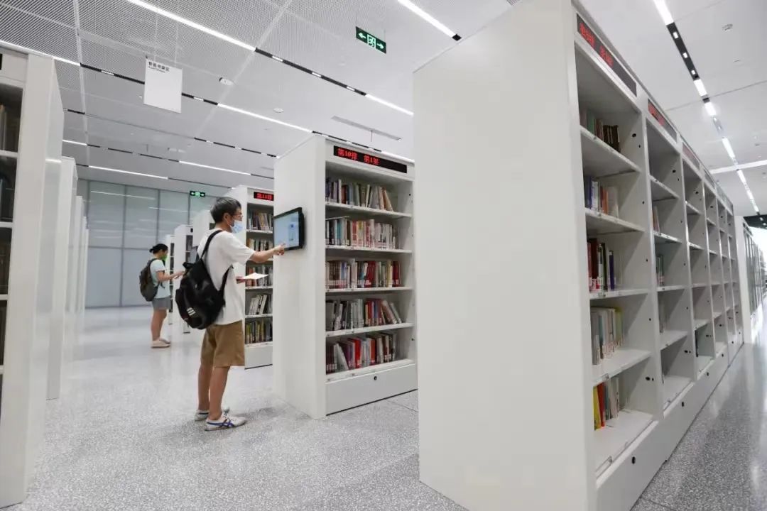 阅读广场的桌椅侧面就是成排书架,提供借阅一体服务。不同于传统书架,这是一片智能书架,可以放置4万多册图书。书架侧面有检索屏幕,输入书名,就能快速导航到具体书架和层架。阅读后如果想把书带回家,可以扫码借书,也可以通过自助借还机完成借阅。