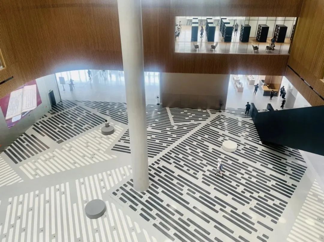 一楼大厅地面,上海本土艺术家申凡的作品《往来春秋》由报纸影像重叠而成,当具象的文字被时光消解后,留下段落和标点,直观表达了书刊中段落结构的形式之美。