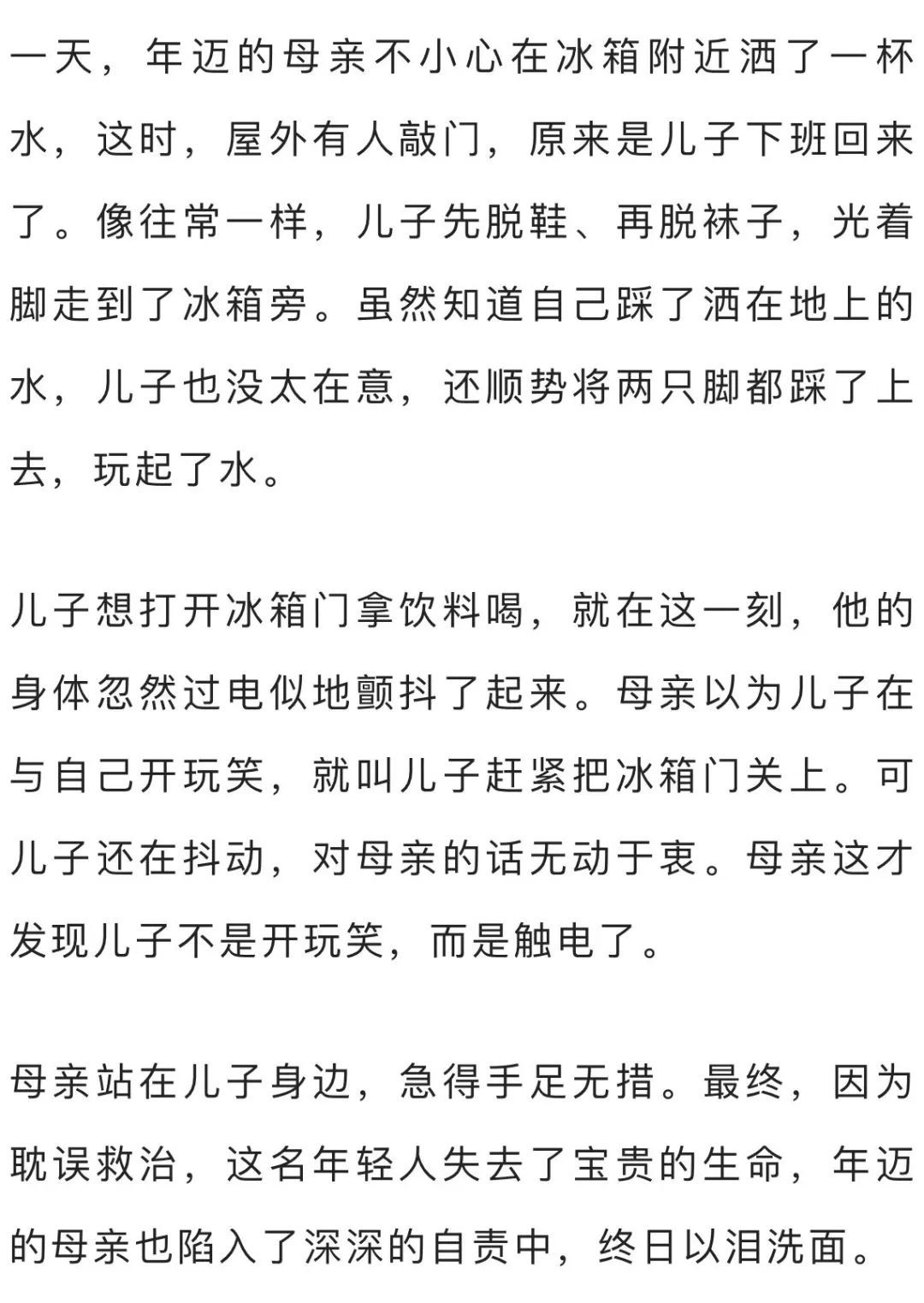 最后,提醒中老年朋友,在使用电器时一定要注意安全,不要用湿手触摸电源,也不要用湿脚踩触电线等。一旦发生触电,要保持冷静,正确应对。
