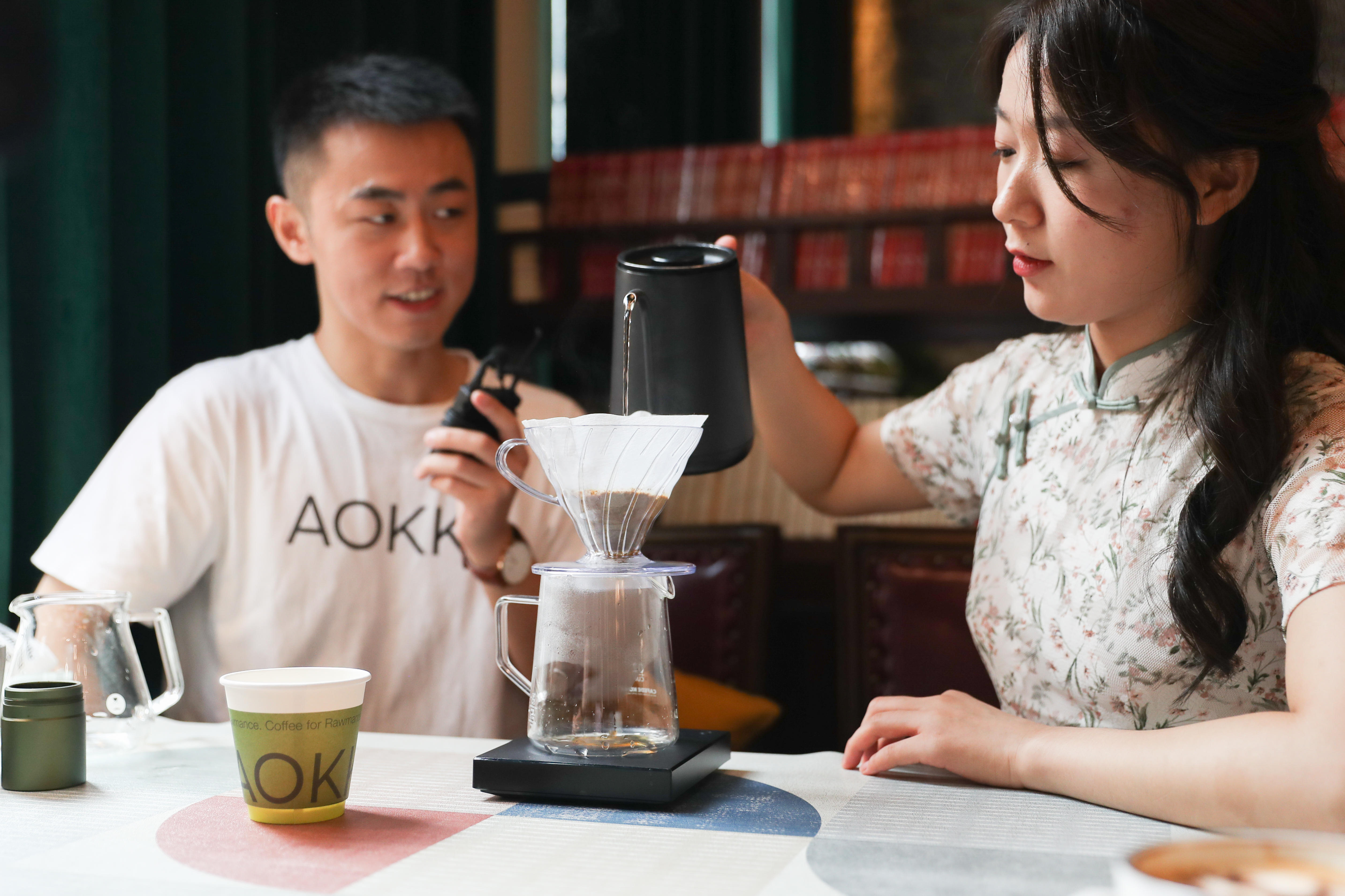 在刚结束不久的一场手冲咖啡体验课上,地处九江路230号的读者书店请到了来自AOKKA的资深咖啡品鉴师辉辉老师,在现场教参与者如何做一杯醇香的手冲咖啡。