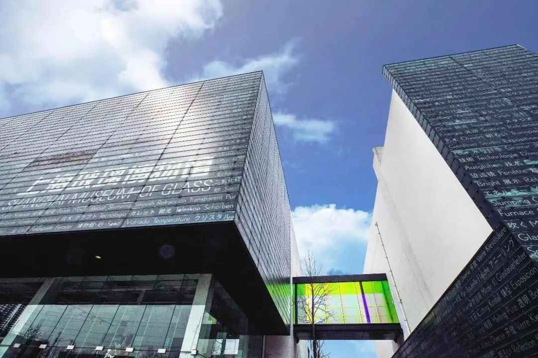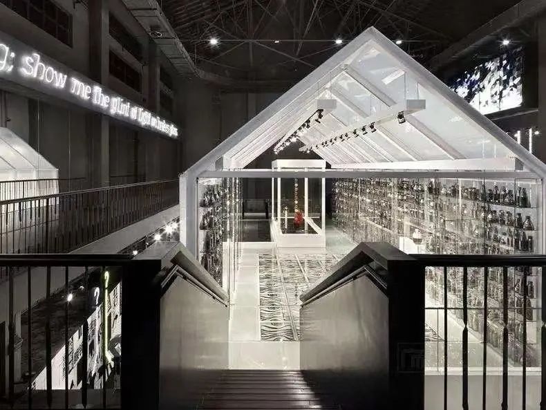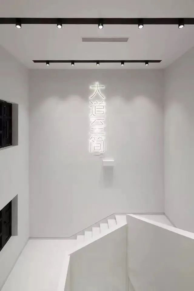 纯白色的楼梯和墙面完美诠释了白色霓虹灯管亮出的“大道至简”四个字,呈现出上海玻璃博物馆干净剔透的美感。