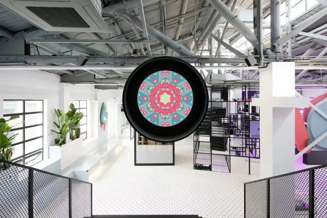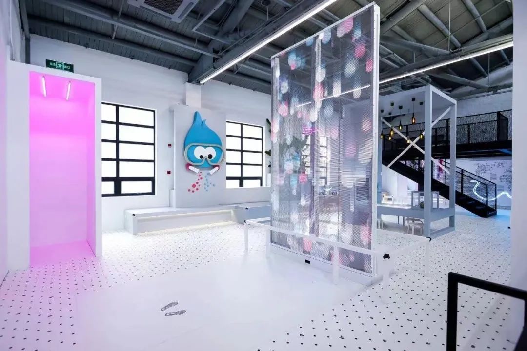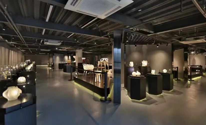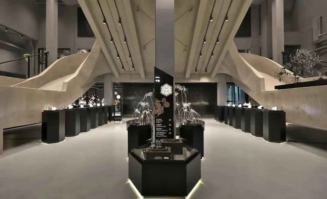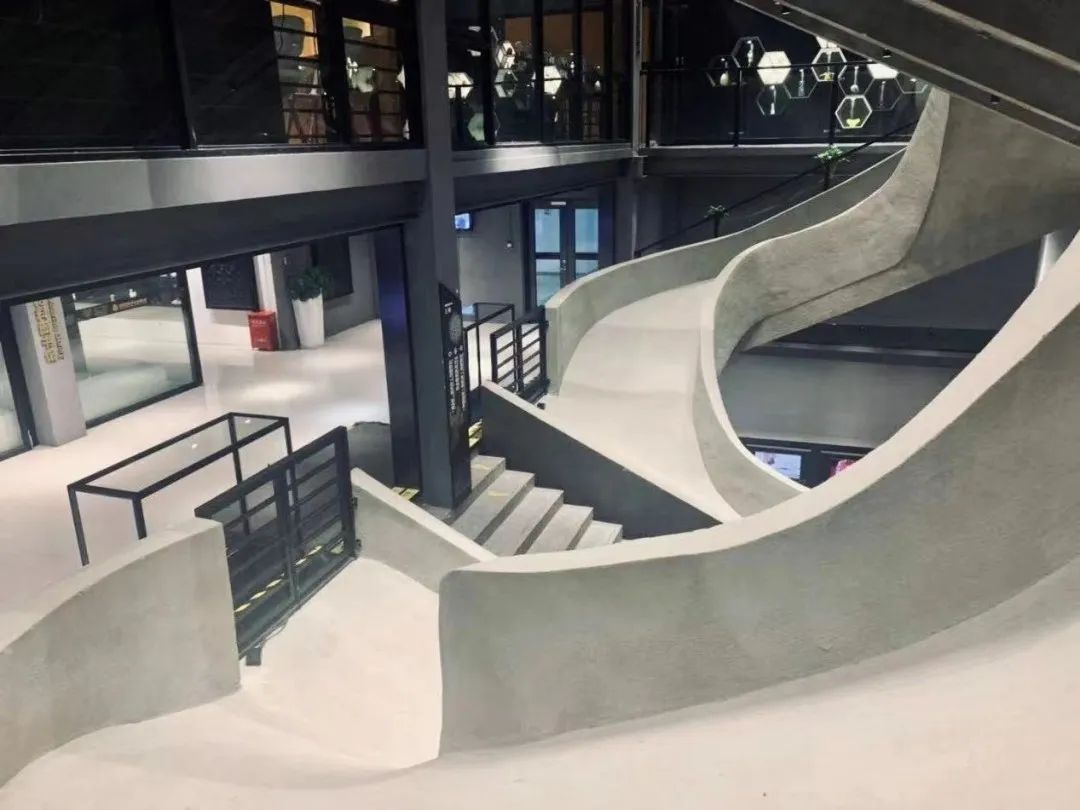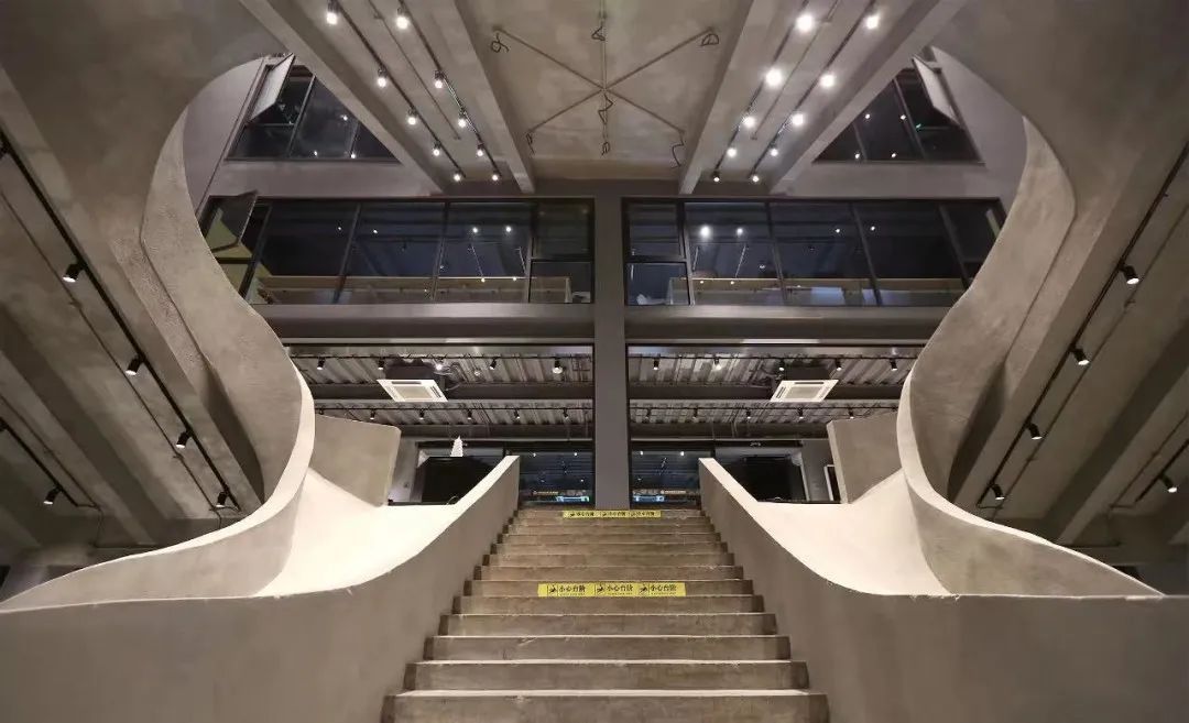 贯通整个楼层的水泥道盘旋而上,将头顶空间分割成对称的弧线,被保留下来的送货大滑道成为中国3D打印文化博物馆最出片的地方之一。