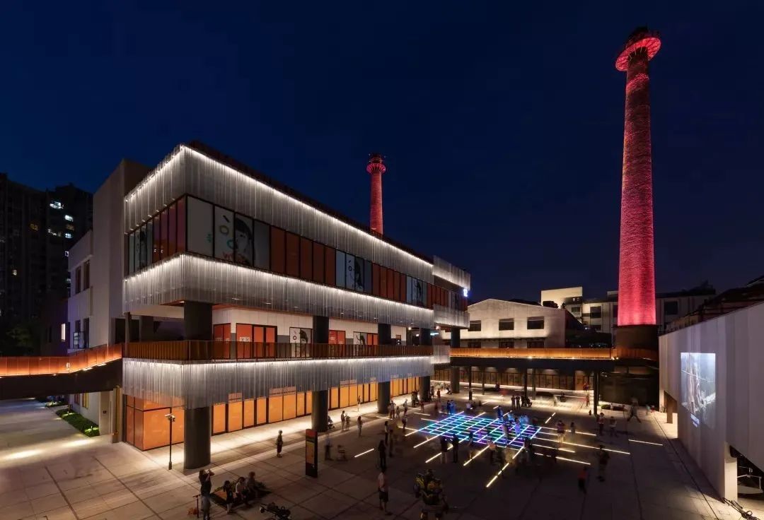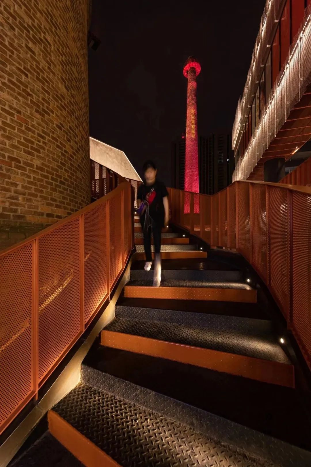 保温瓶胆厂标志性的大烟囱在星空下发出五光十色,斑驳红砖旁的橘色楼梯染上金属光泽,三邻桥的24小时都是律动的。