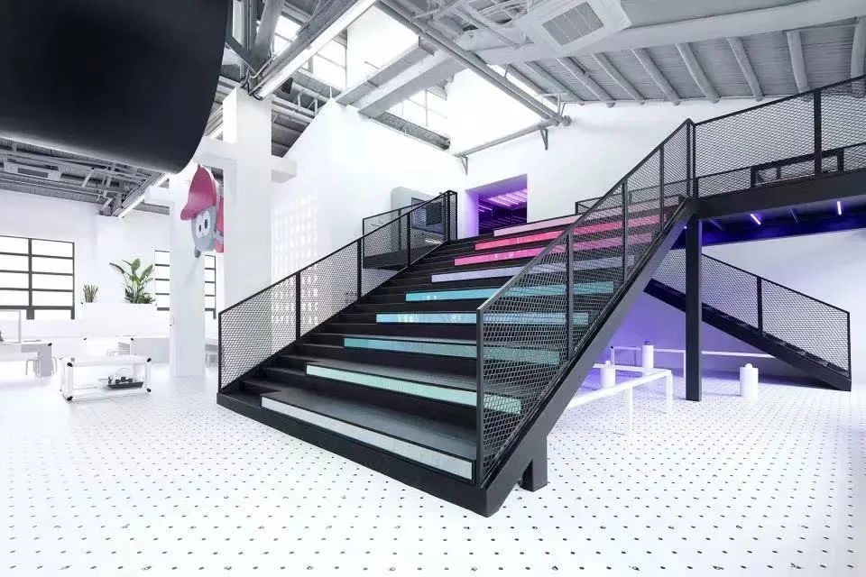 黑白对比强烈的儿童玻璃博物馆内,黑色楼梯被染上了色彩,如同万花筒里的炫彩缤纷,踩上去仿佛就能化身成为舞动精灵。