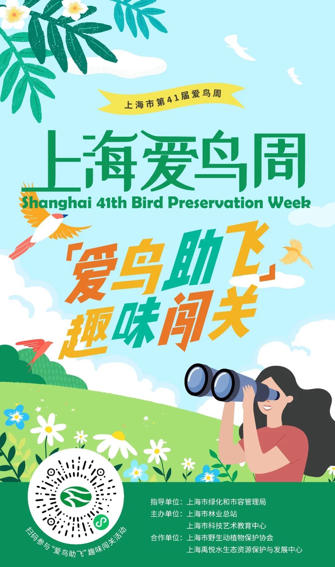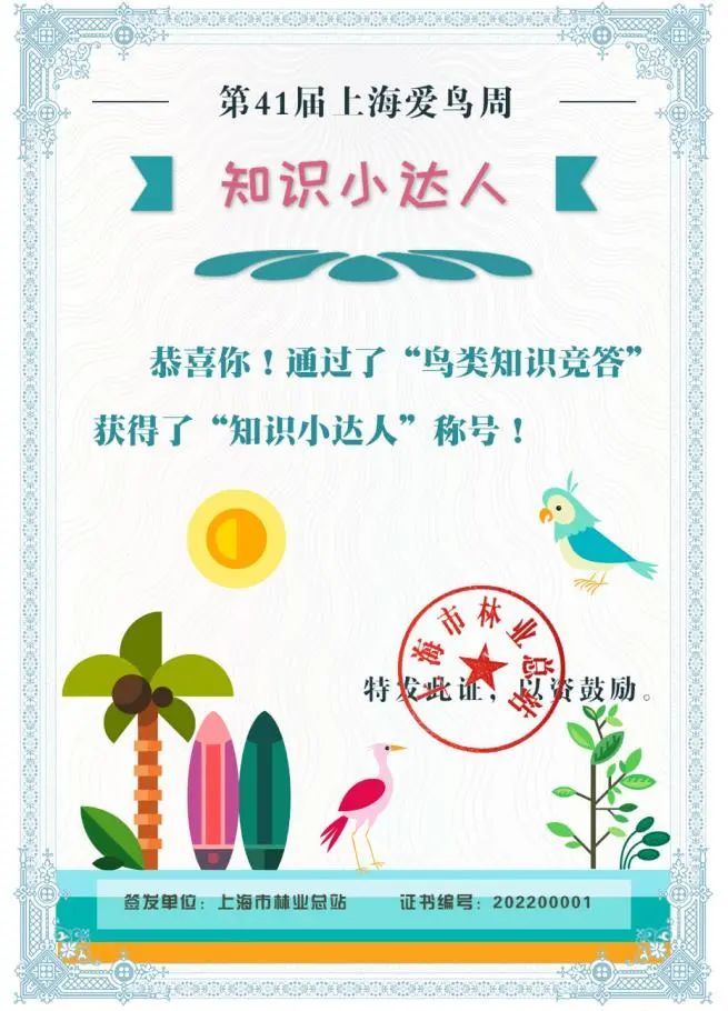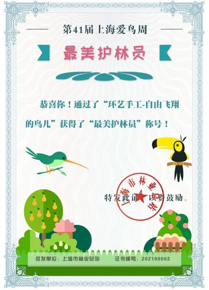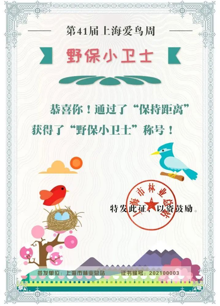 第41届上海爱鸟周系列活动之一——“爱鸟助飞”趣味闯关通道即将开启!本次活动一共设置了4个任务关卡,完成全部关卡即可获得由上海市林业总站签发的电子证书,以及“爱鸟礼包”抽奖机会,1111份爱鸟礼包在向你们招手哦~请关注“上海林业”微信公众号,也许中奖的就是你!