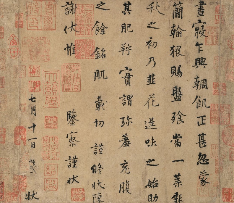 释文:昼寝乍兴,朝(輖)饥正甚,忽蒙简翰,猥赐盘飧。当一叶报秋之初,乃韭花逞味之始,助其肥羜,实谓珍羞。充腹之馀,铭肌载切。谨修状陈谢,伏惟鉴察谨状。七月十一日,状。