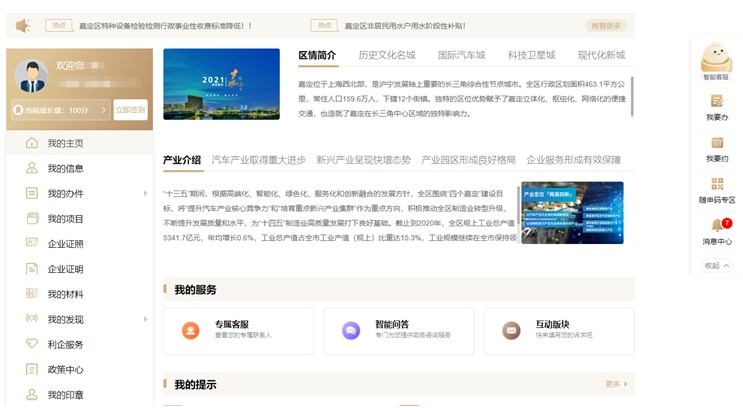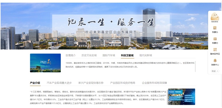嘉定区是虹桥国际开放枢纽的西北战略门户,是沪宁发展轴上的枢纽节点,也是上海的产业重镇和制造业大区。为更好地优化营商环境,赋能上海“五个新城”建设,嘉定区自2020年起建设企业专属网页功能,通过站在企业视角不断地迭代更新,逐渐将其打造成为满足企业用户全方位需求的服务平台。
