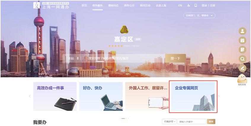打开上海“一网通办”总门户嘉定频道,选择“企业专属网页”专栏,即可以游客身份访问。