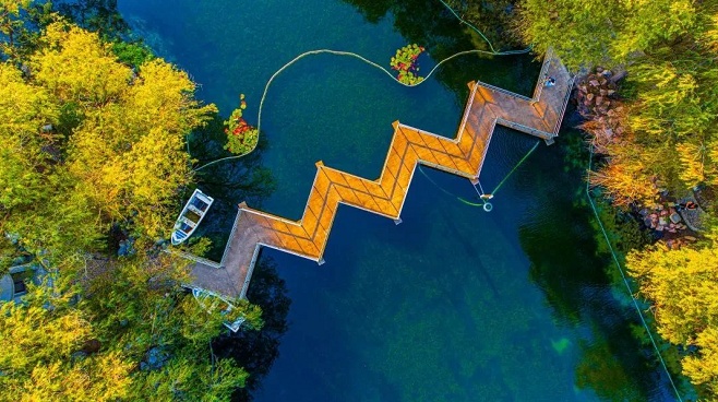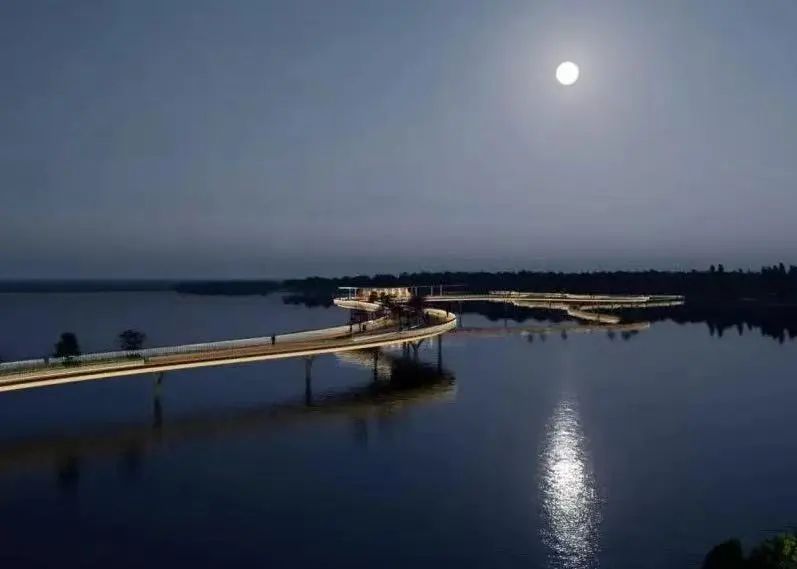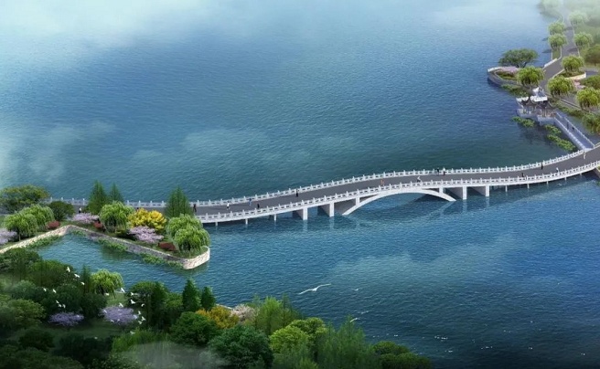 站在景观桥上,指点湖水