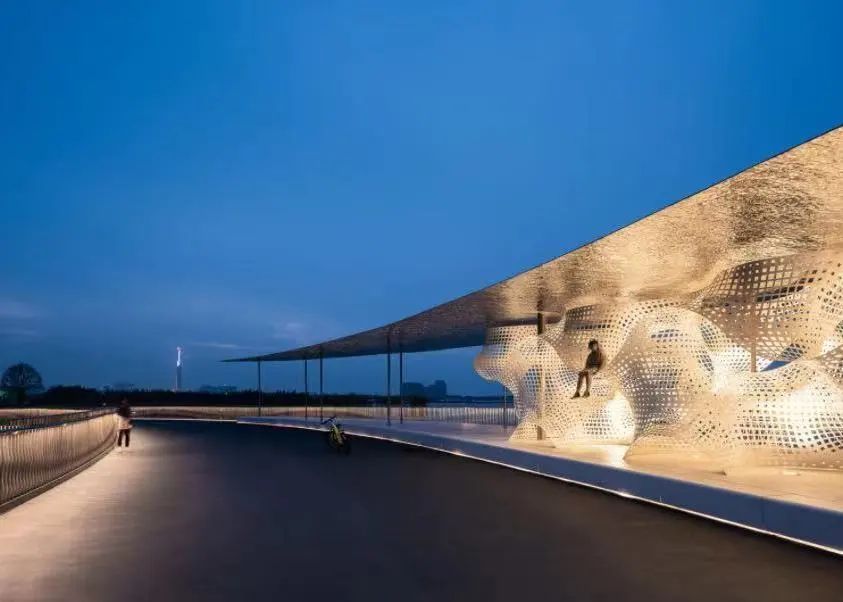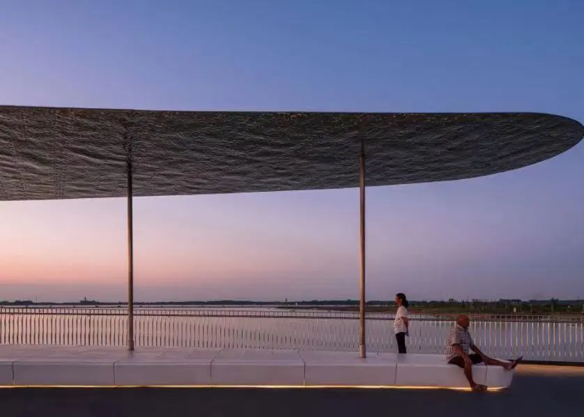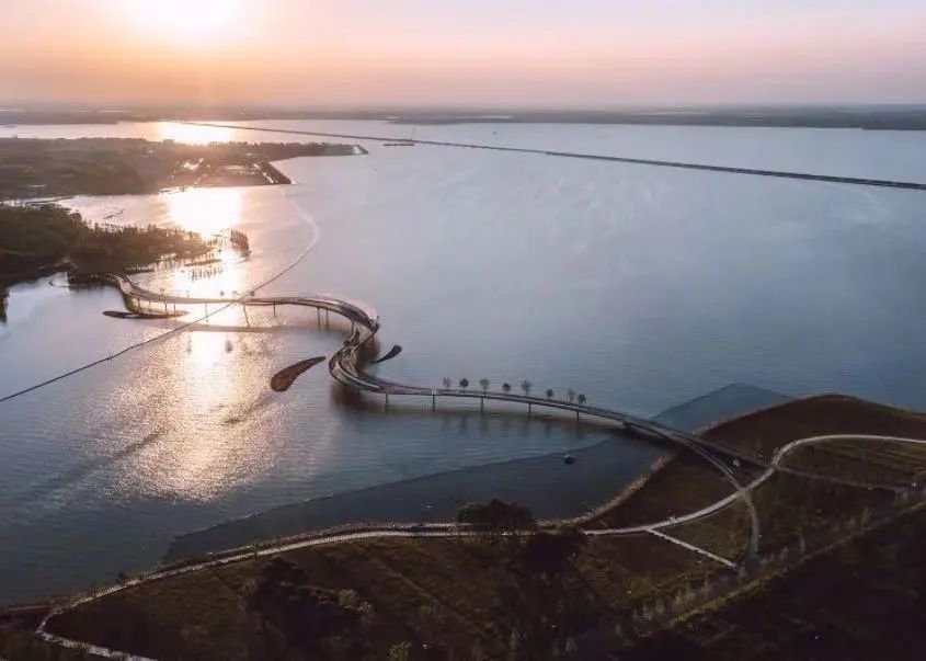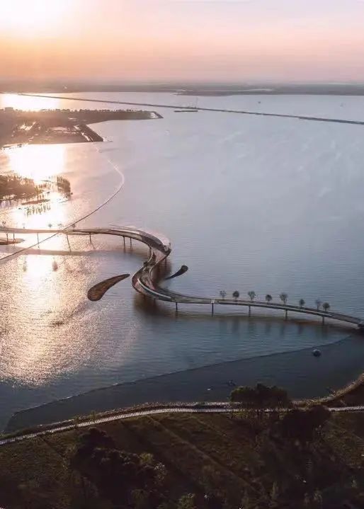 元荡景观步行桥宛若一条随风飘动的彩缎横跨沪苏两地,又宛如盘龙卧波静于元荡湖上,十分壮观!