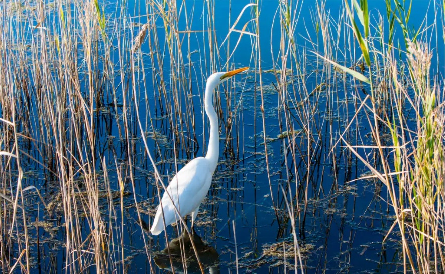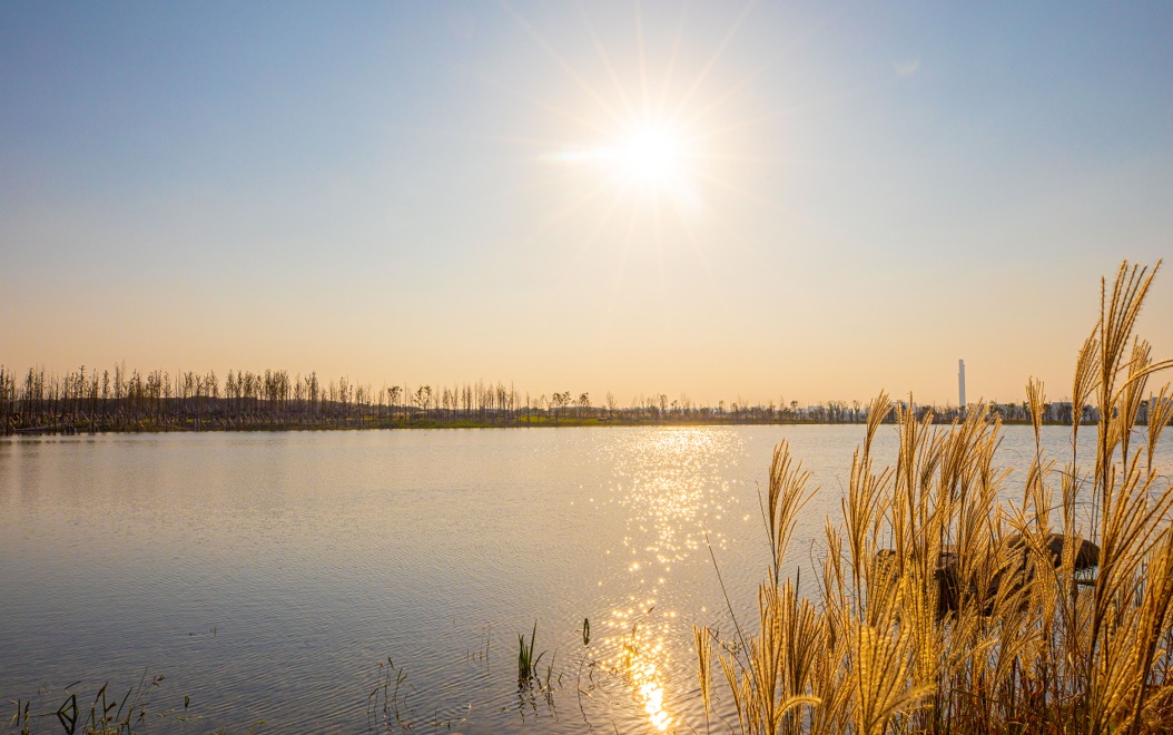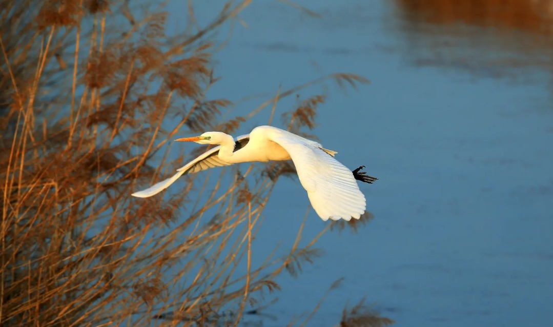 湖岸边一只只小白鹭,时而展翅在高空中盘旋,时而掠过水面,给人带来亲近自然的惊喜,左侧油菜田灿烂绽放成一片金色花海的怡然景致。“清水元荡”又重回青浦人的怀抱。
